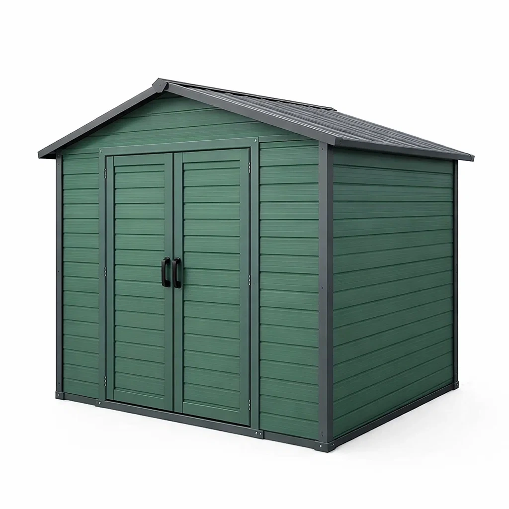 L'abri de jardin est fabriqué en PVC résistant aux intempéries, assurant durabilité et intégration harmonieuse dans l'environnement extérieur.