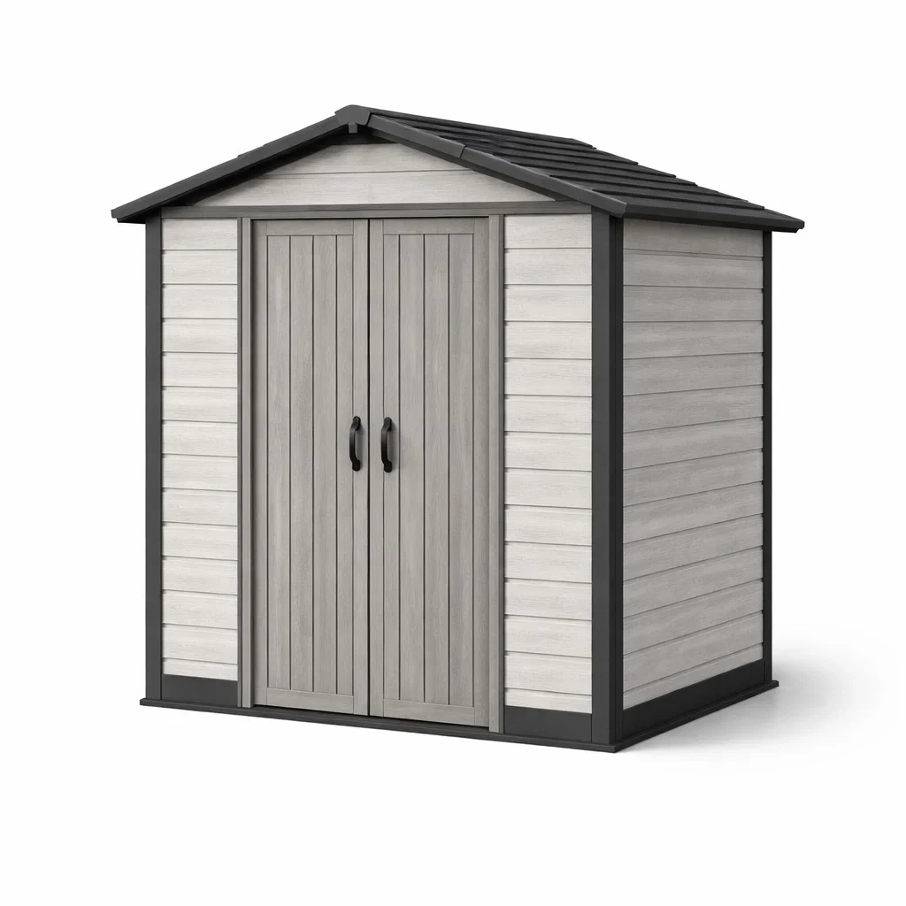 Abri de jardin en résine avec finition imitation bois, résistant aux intempéries et aux UV.