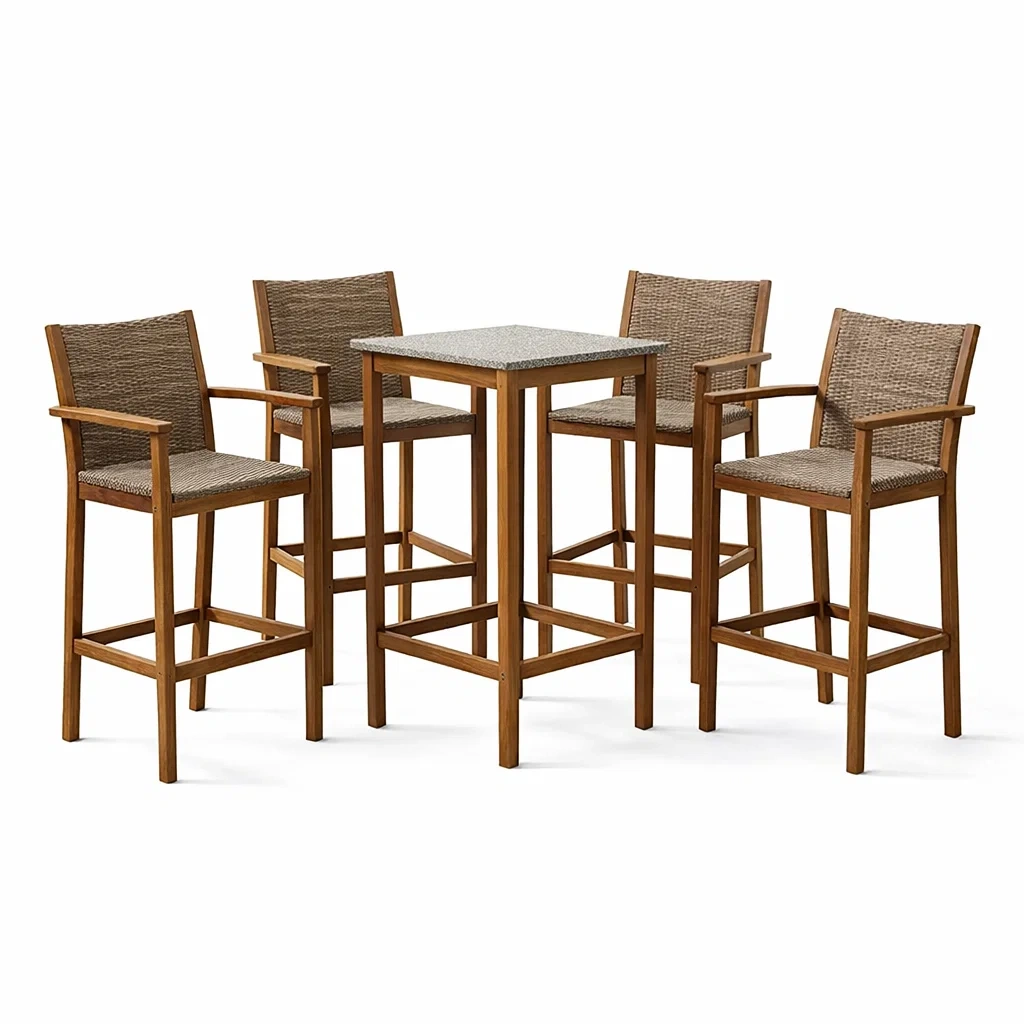 Matériaux : Structure en bois d'eucalyptus, assise et dossier en rotin synthétique, plateau de table en bois d'eucalyptus.