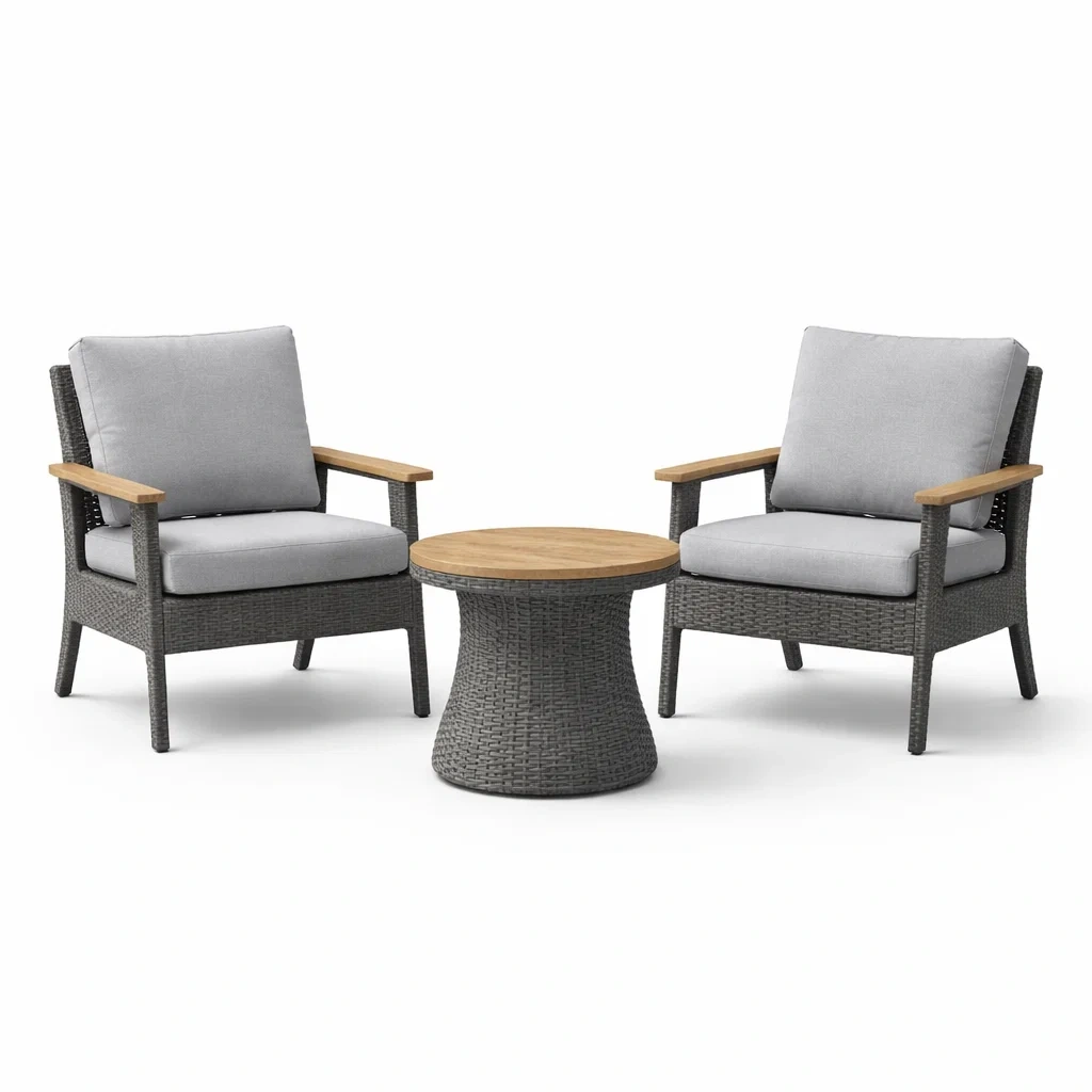 L'ensemble comprend deux fauteuils en résine de polyéthylène tressée avec accoudoirs en bois d'acacia et une table assortie en bois d'acacia.