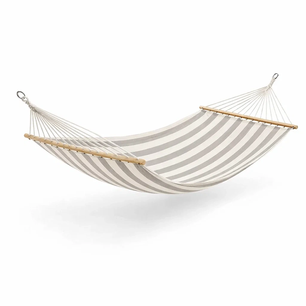 Ce hamac est fabriqué en toile de coton et polyester pour offrir résistance et durabilité. Le design rayé crème et gris ajoute une touche décorative. Capacité maximale de 150 kg.